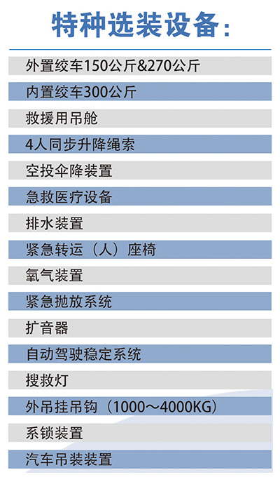 救护型用于紧急医疗救护、突发事件发生时可将医疗队送达出事点,并对遇难者给予医疗救护或者将病人、伤员输送到常设医疗机构。救护型上配有两副担架及医疗急救系统工具箱。